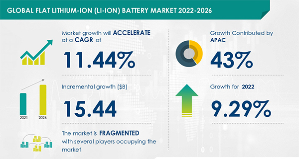 纽约 2022 年 8 月 2 日 /美通社/ -- 智能手机需求的增长明显推动了 扁平锂离子电池市场 增长,尽管替代产品的可用性等因素可能会阻碍市场增长。根据 Technavio 的最新报告,从 2021 年到 2026 年,市场价值将增长 154.4 亿美元,复合年增长率为 11.44%。2022年市场的同比增长率估计为9.29%。此外,该报告还详细分析了驱动因素和机会、最佳获胜策略、竞争情景、未来市场趋势、市场规模和估计以及主要投资领域。